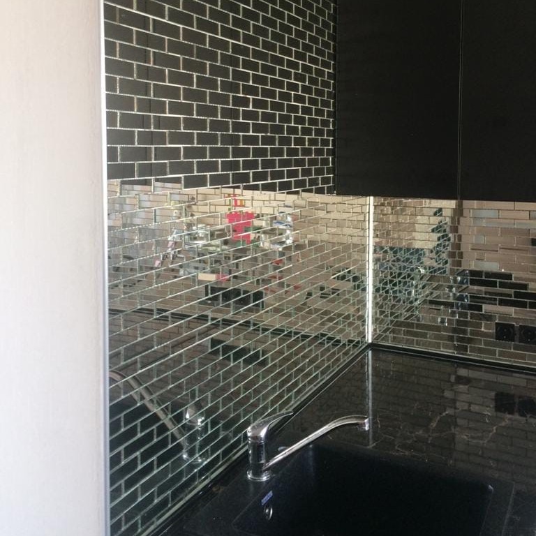 Использована квадратная серебристая зеркальная плитка размером 18х18.